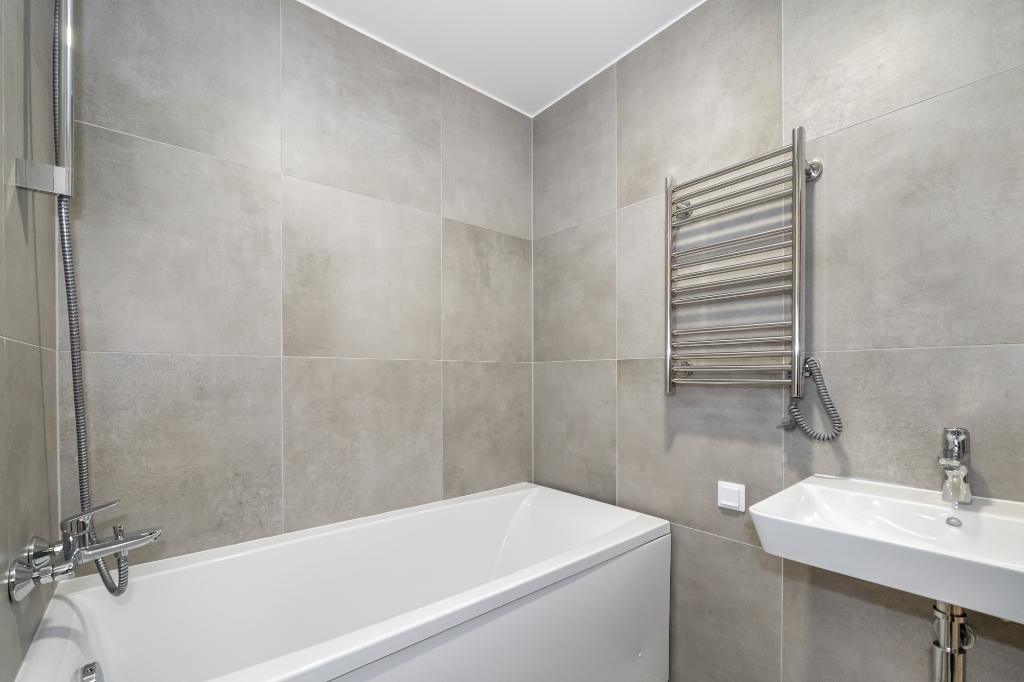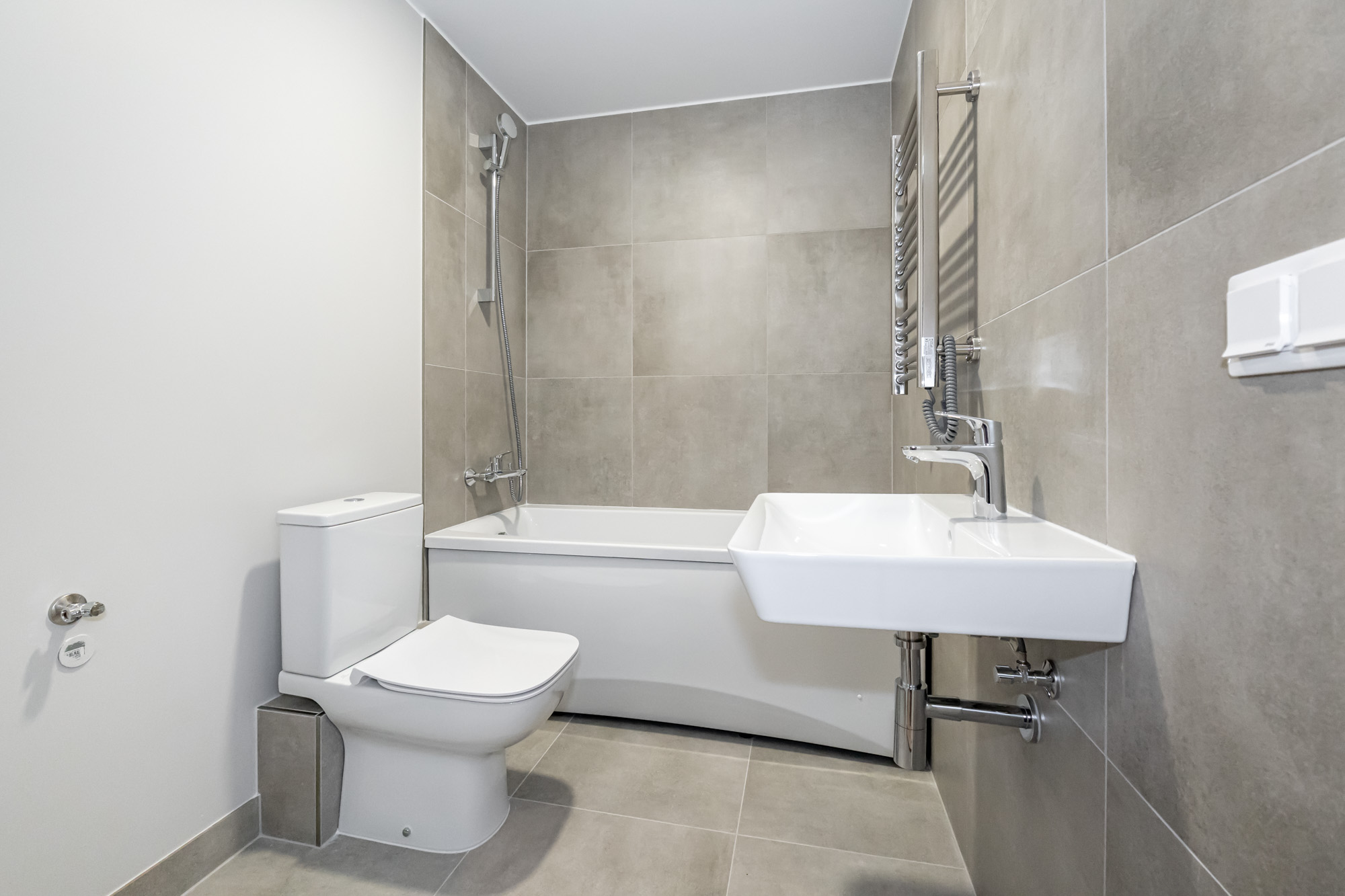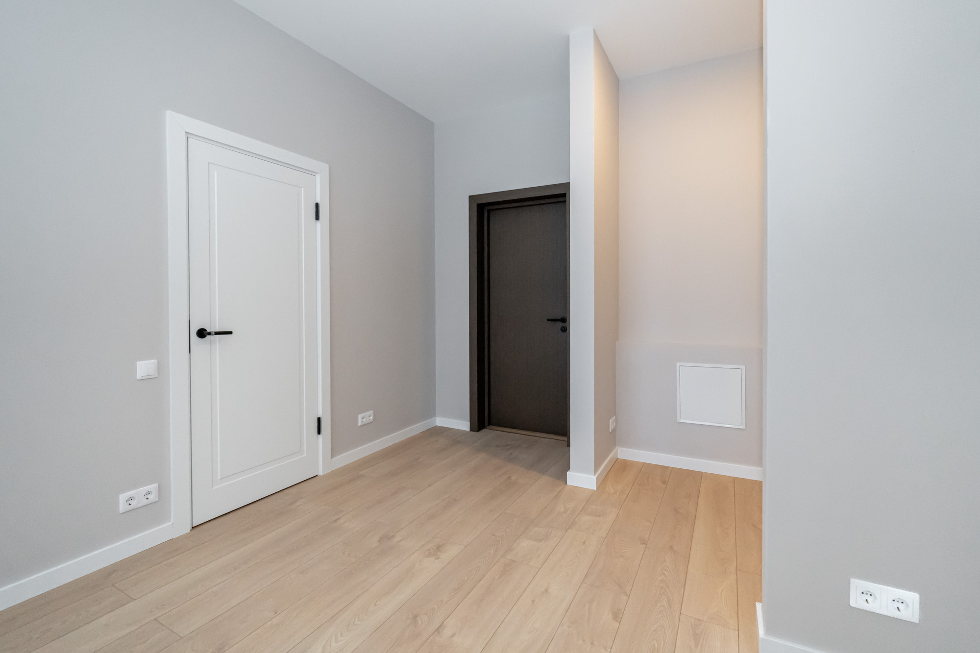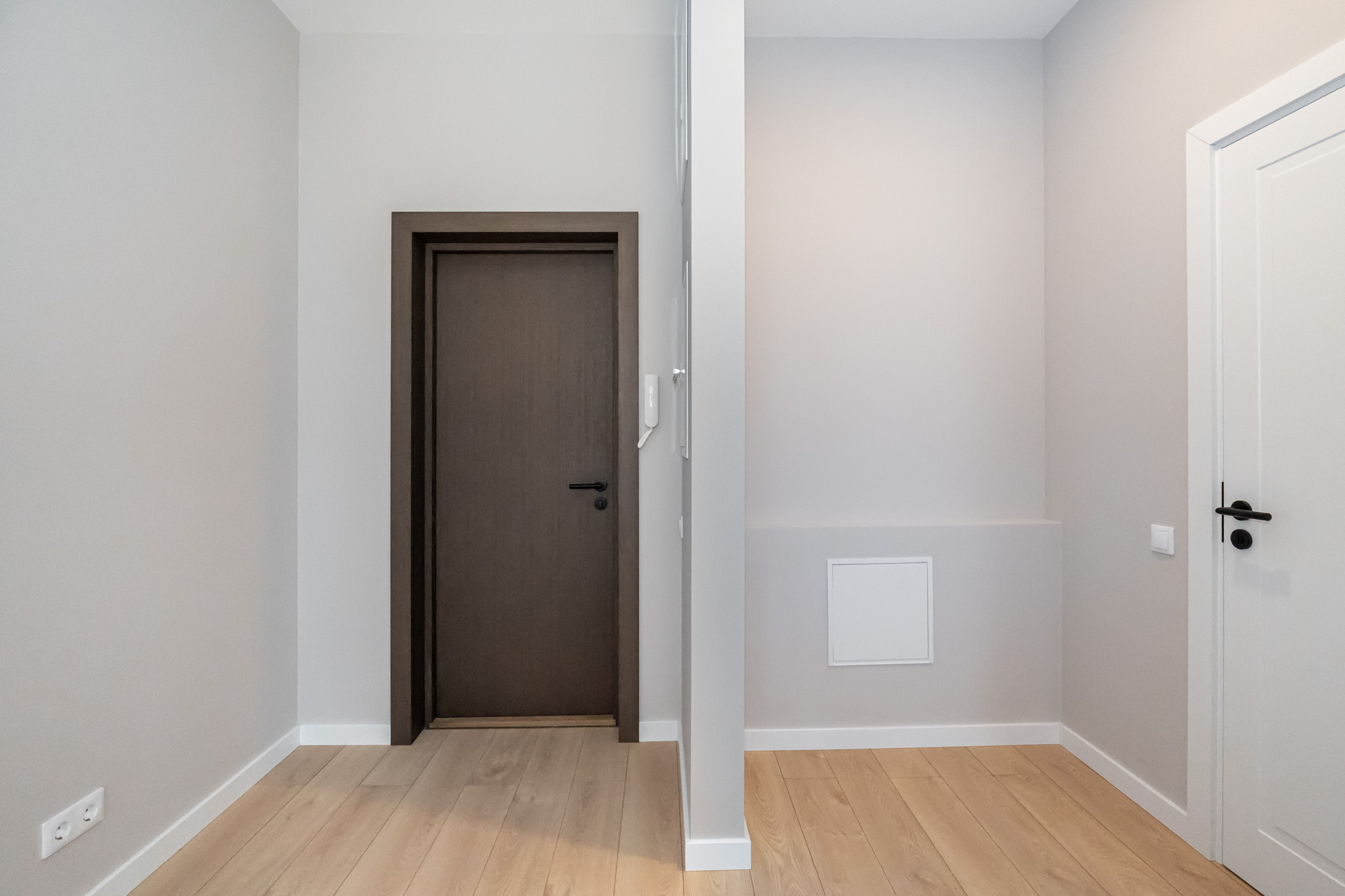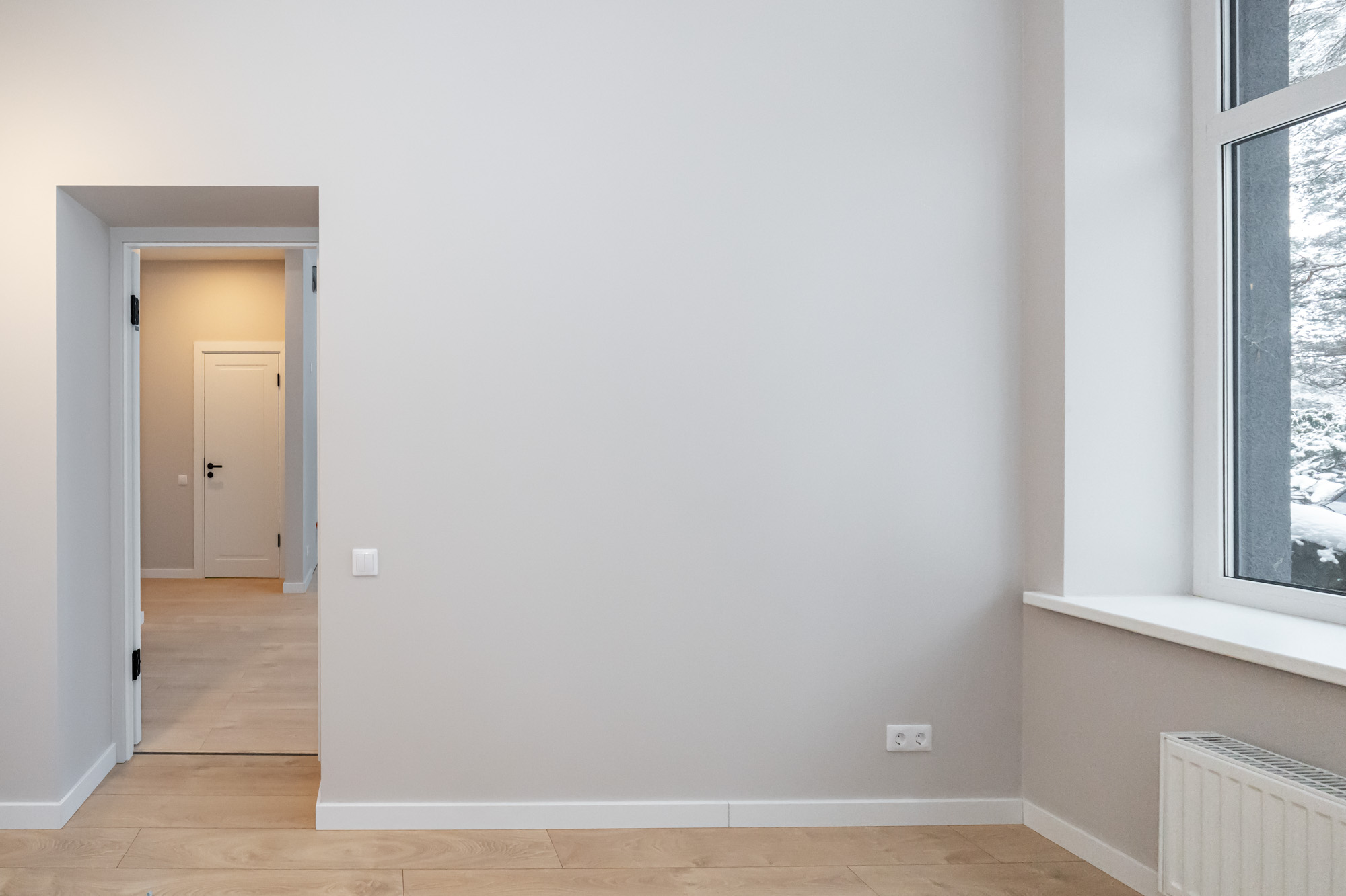 The apartment is decorated in austere, contemporary primary colors — white, gray, and beige — that are easy to adapt to any interior style. The apartment is offered with full interior decoration.