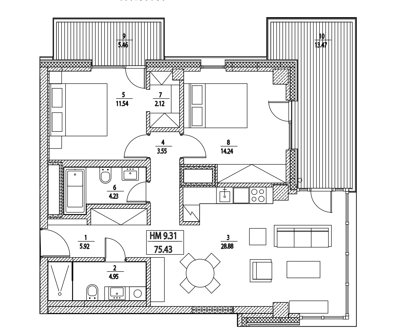 Kopējā platība 115,20 m², kas ietver plašu dzīvojamo zonu, divas guļamistabas, divas vannas istabas un terasi ar skaistu skatu. Šis unikālais projekts ir radīts tiem, kas novērtē harmoniju starp dabu un pilsētas dinamiku. Rezidences atrodas Daugavas krastā, nodrošinot ne tikai elpu aizraujošus skatus, bet arī mierpilnu atmosfēru. Projekta arhitektūra ir iedvesmota no filozofijas un vēstures, radot izsmalcinātu vidi modernai un kvalitatīvai dzīvei.