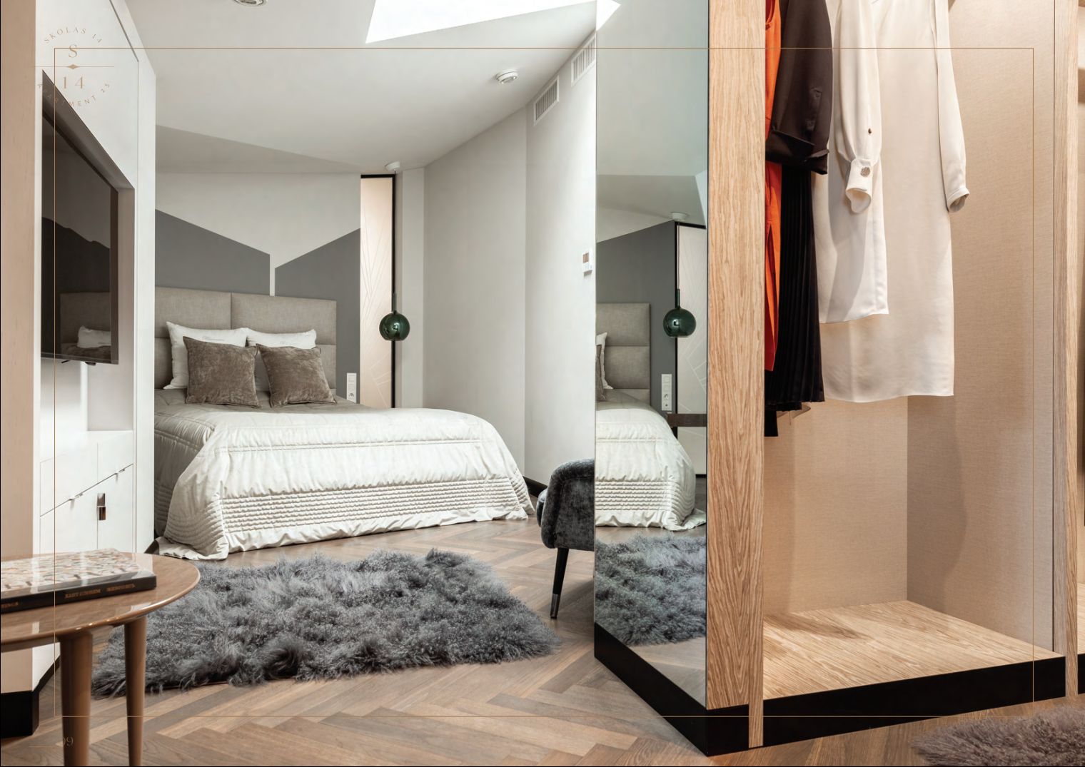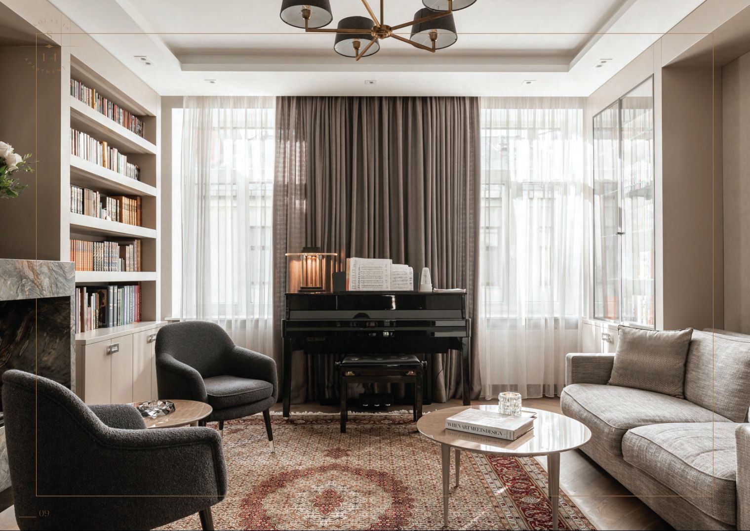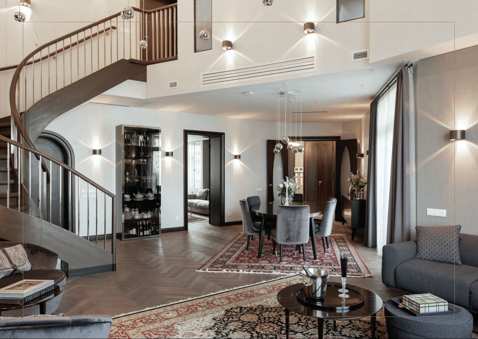 Dzīvoklis izvietots piektajā un sestajā stāvā, piedāvājot plašumu, gaismu un arhitektonisku eleganci. Īpašu noskaņu rada iespaidīgā viesistaba ar sešus metrus augstiem griestiem, kamīnu un klavierēm — telpa, kas ideāli piemērota gan mierīgai ikdienai, gan reprezentabliem vakariem.