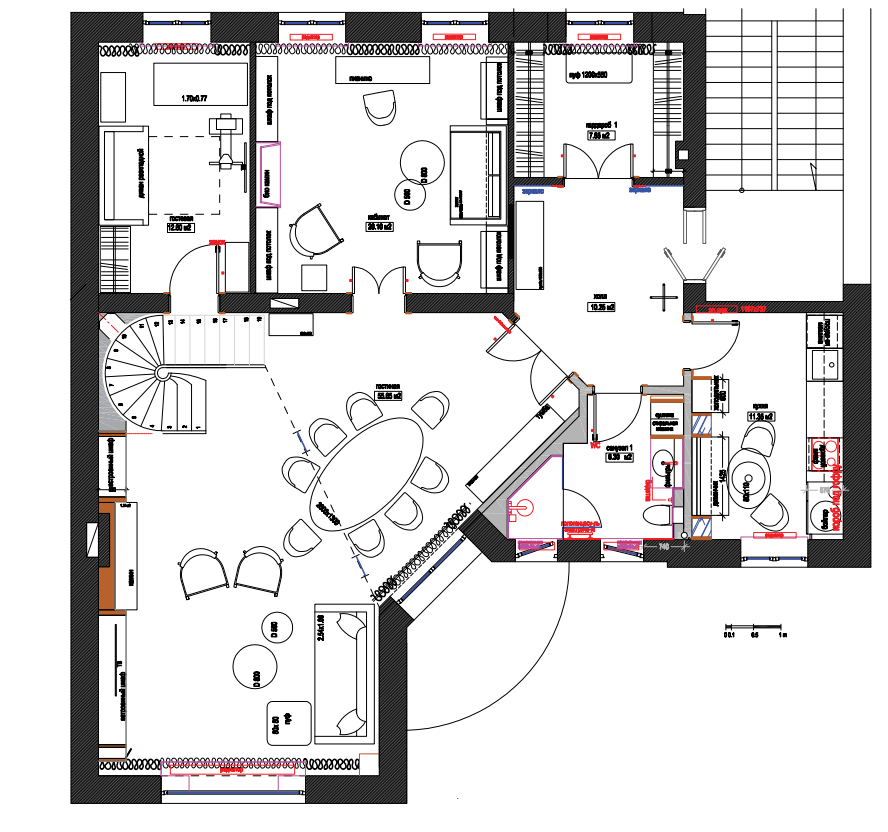 1. līmenis: Priekšnams, garderobe, virtuve ar ēdamzonu, plaša viesistaba, kabinets ar bibliotēku un kamīnu, viesu guļamistaba, vannasistaba ar tualeti, balkons/terase.