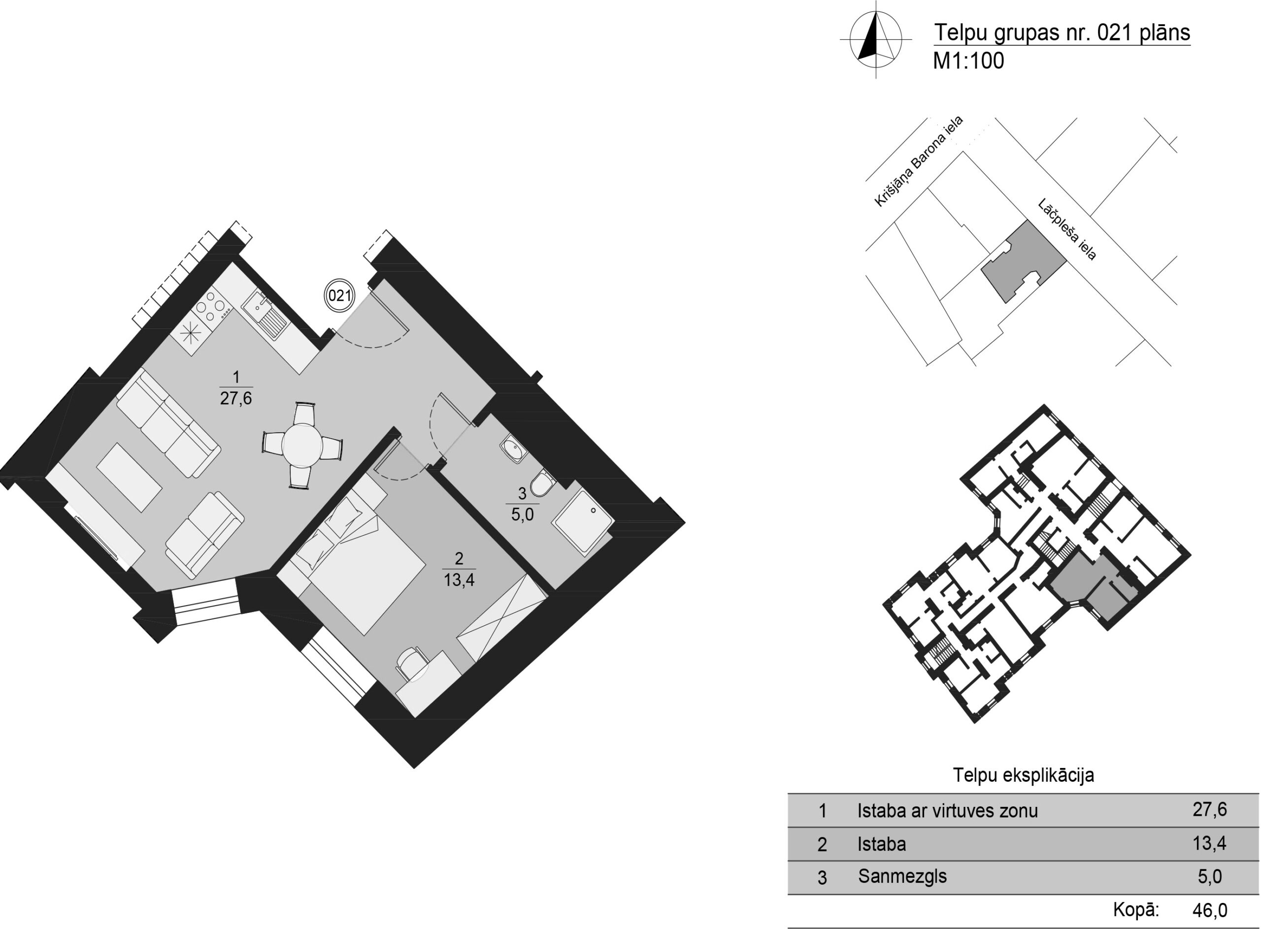 Kopējā dzīvokļa platība- 46 m²