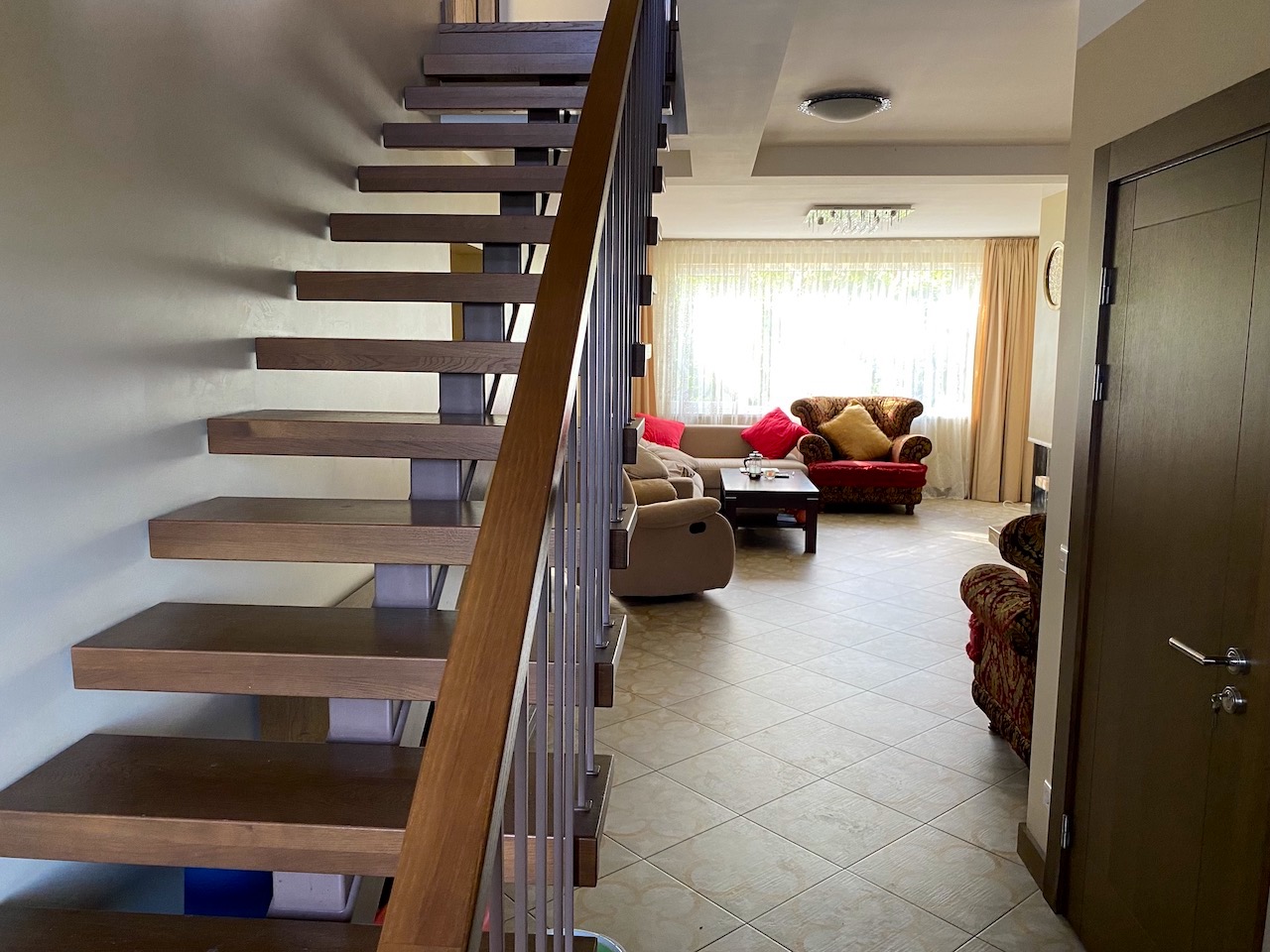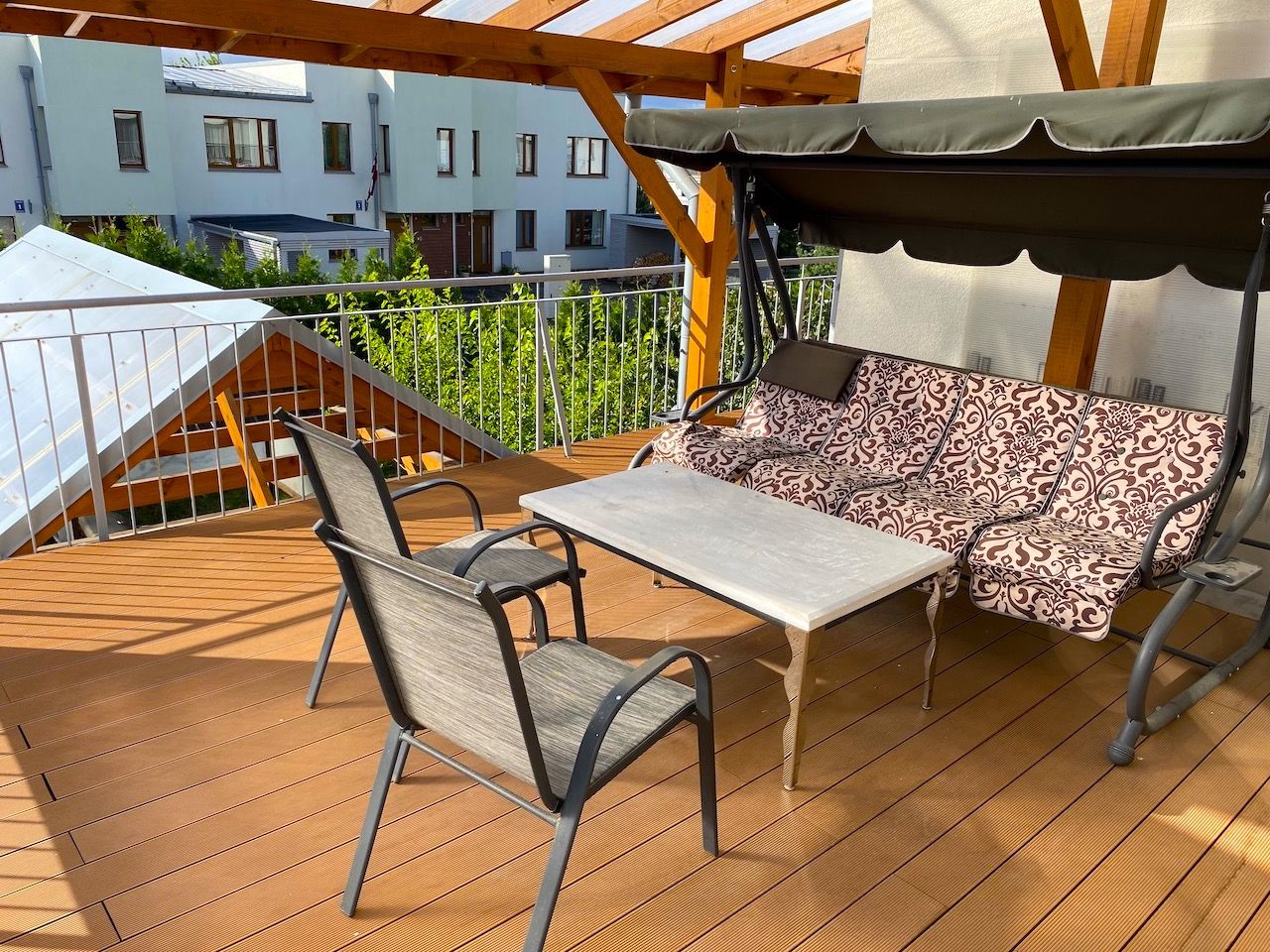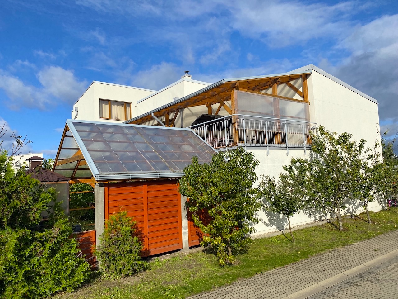 Tiek piedāvāta mūsdienīga, divstāvu rindu māja ar pārdomātu plānojumu un plašām, gaišām telpām. Šī māja ir unikāla – veikta dzīvojamās zonas paplašināšana ar lielu ēdamistabu un divām apjumtām terasēm, tādēļ tā atšķiras no citām šī ciemata mājām.