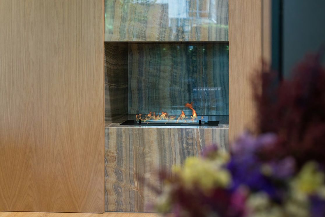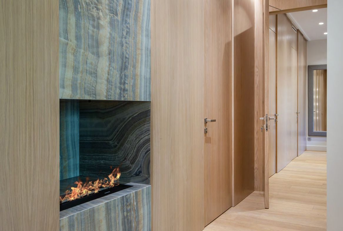 Moderns bio-kamins, ventilācijas sistēma ar rekuperāciju, kondicionēšana ar gaisa attīrīšanu