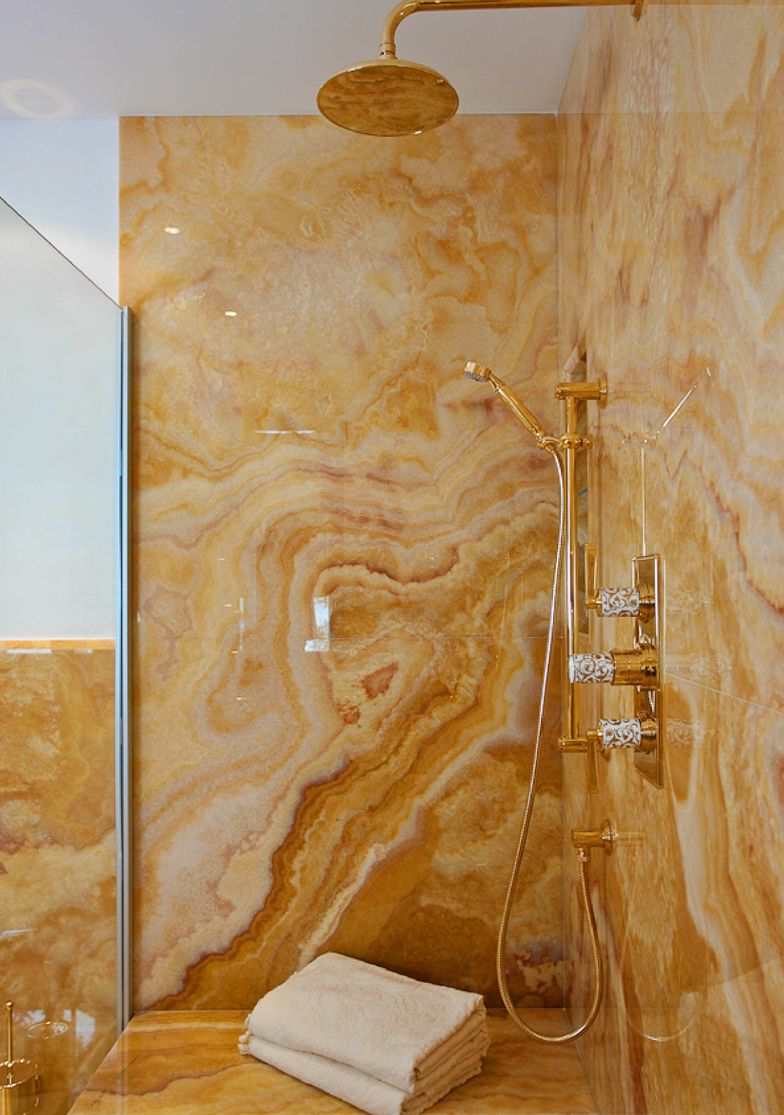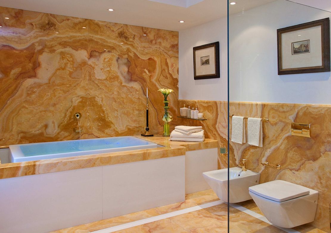 Galvenā vannas istaba ar Onyx apdari, dizaina santehniku un pat ūdensizturīgu televizoru – radīta kā privāts relaksācijas stūrītis.