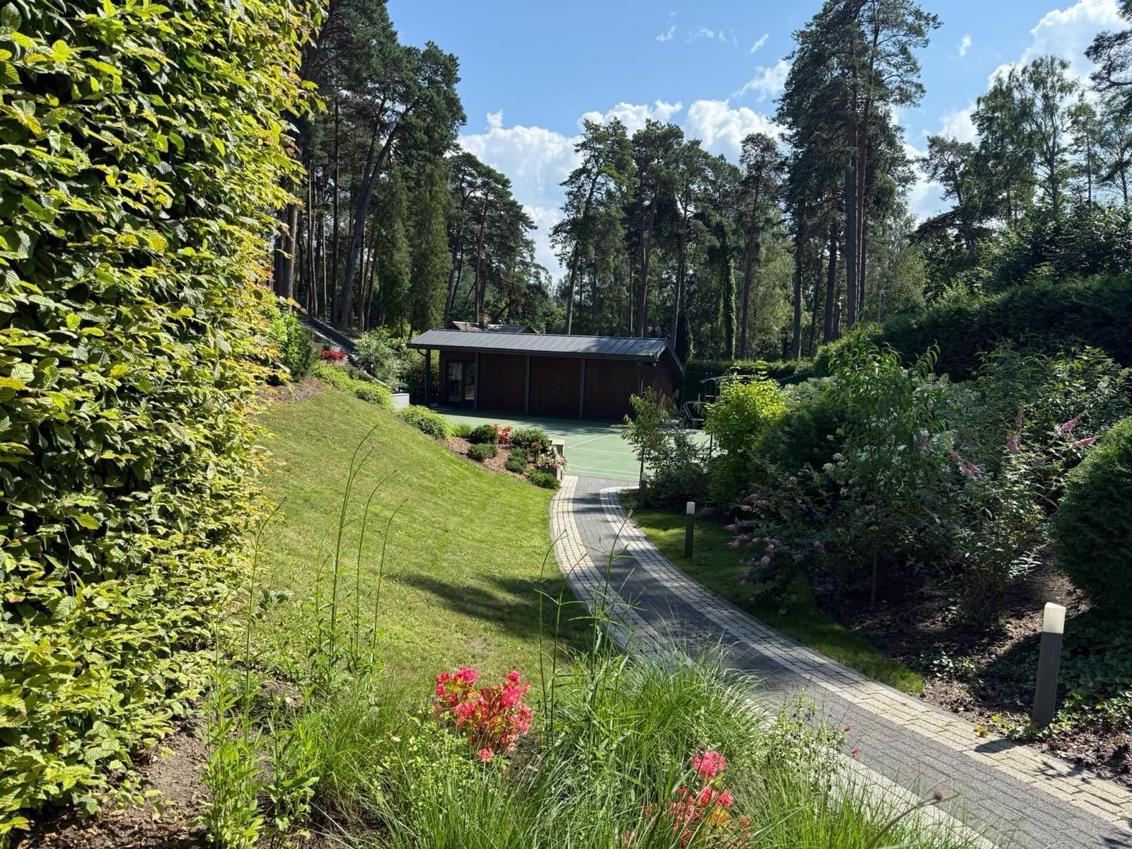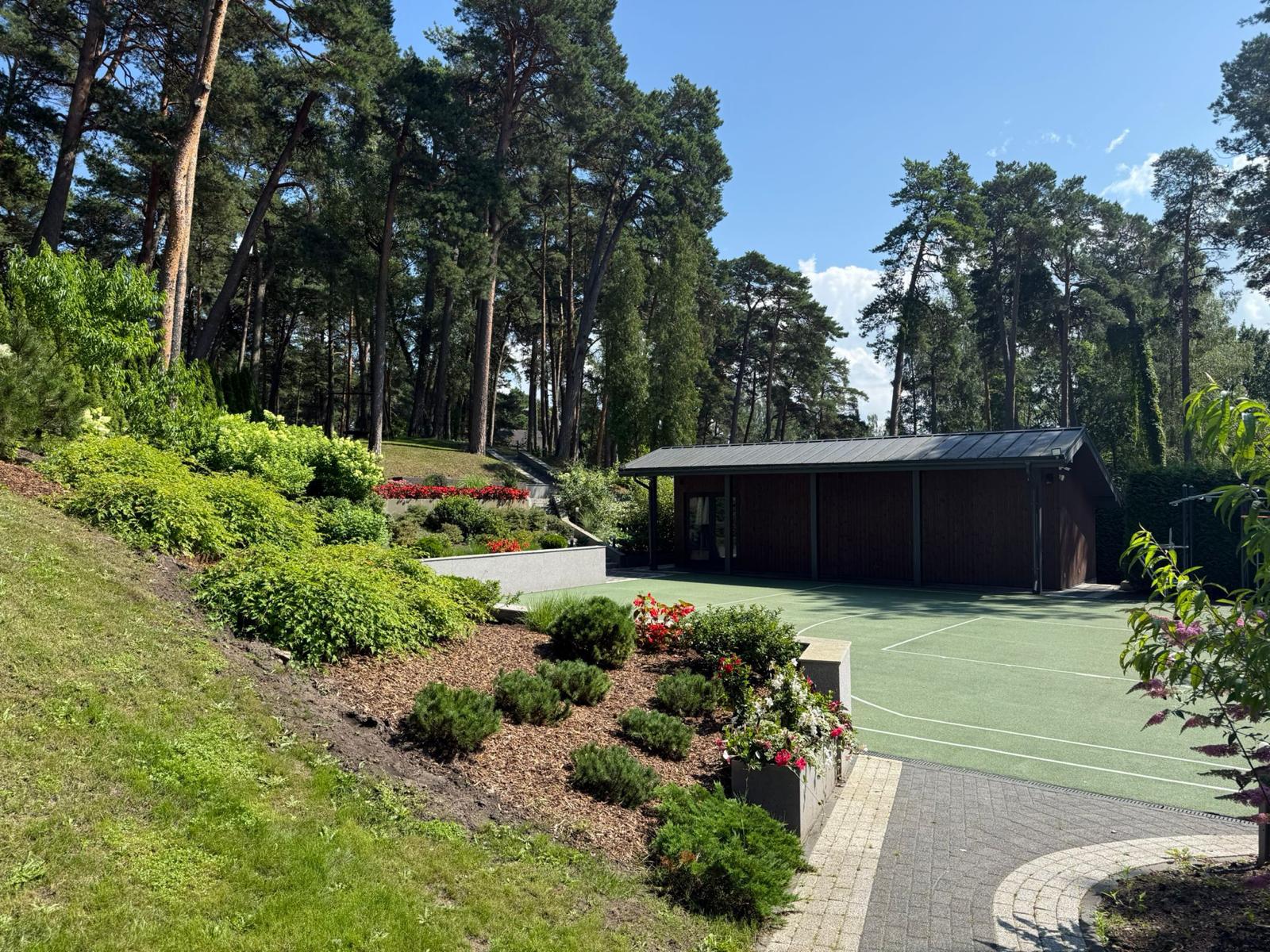 Plašais 4544 m² zemesgabals ir rūpīgi kopts un apzaļumots, radot privātu oāzi priežu meža ielokā. Teritorijā izvietotas vairākas ēkas, plaša atpūtas zona un sporta infrastruktūra, kas piemērota gan relaksācijai, gan aktīvam dzīvesveidam.